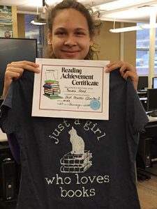 picture of top reader holding certificate and special t-shirt