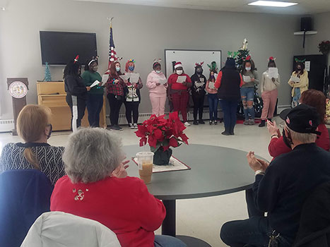 image of students bringing holiday spirit and singing.picture of senior citizens seated at tables clapping their hands while watching chorus perform